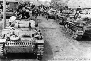 Pz Kpfw II in a Russian village, together with several Pz Kpfw III and Pz Kpfw IV.
