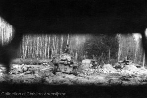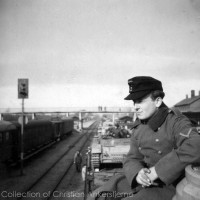 Soldier sitting on the turret of a Pz Kpfw IV Ausf. G or H, in front of a Pz Kpfw III hull, at the train station of Viborg, Denmark.