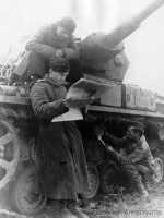 Staged photograph of two crew members reading a newspaper, while another one is repairing a Pz Kpfw IV Ausf. G.