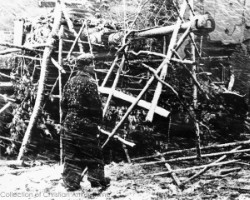 This Pz Kpfw IV has been camouflaged by stacking up branches and wooden beams up around it.