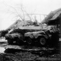 Panzerfunkwagen (Sd Kfz 263) (8 Rad) driving through a town. The crew has mounted a horse shoe to the front for good luck.
