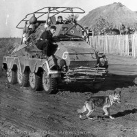 Panzerfunkwagen (Sd Kfz 263) (8 Rad) on the Eastern Front. Notice the facine on the front. According to the original photo caption, the German shepherd is a Societ anti-tank bomb dog, which has been "liberated" by the Germans.