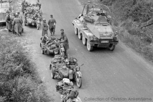 Panzerfunkwagen (Sd Kfz 263) (8 Rad) passing a group of BMW R12 motorcycles of a Kraftmeldezug (motorcycle runner platoon) during the invasion of Fall Gelb.